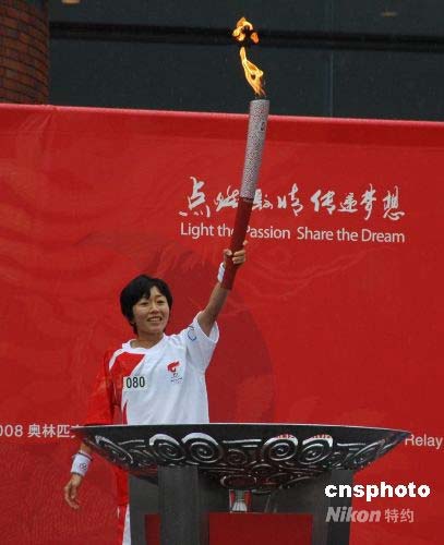 4月26日中午12時17分,北京奧運圣火長野傳遞活動中的最后一位火炬手--雅典奧運會女子馬拉松冠軍野口MIZUKI在展示火炬后點燃圣火盆。中新社發 關妍 攝