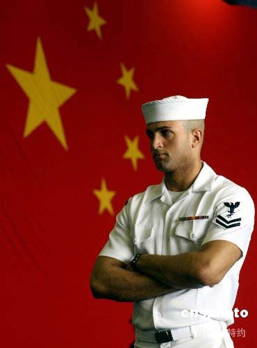 二十八日,訪港的美國(guó)航空母艦“小鷹號(hào)”士兵在中國(guó)五星旗下迎接記者。中新社發(fā) 洪少葵 攝