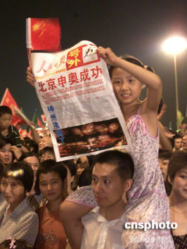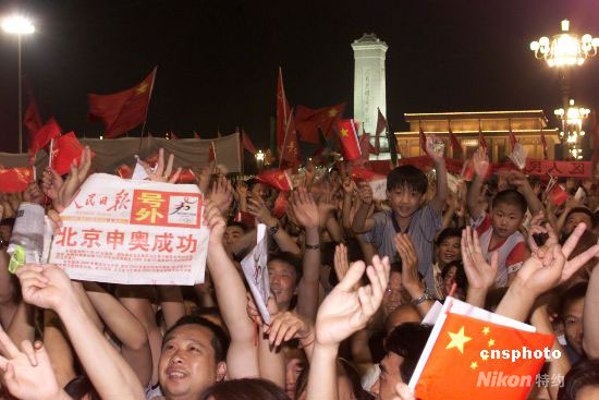 2001年7月13日夜,北京天安門廣場聚集數十萬民眾,慶祝北京申奧成功。毛建軍 攝