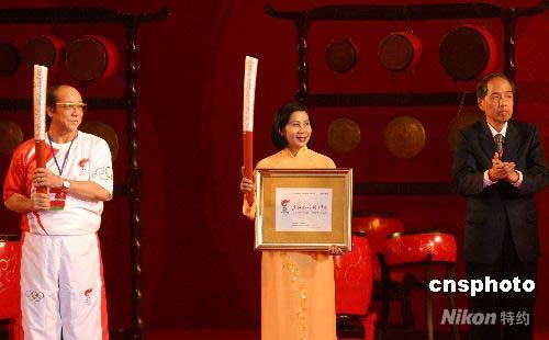 4月29日晚8時20分,在胡志明市第七軍區體育館內,越南奧委會主席阮明泰用手中的“祥云”火炬點燃圣火盆,北京奧運圣火在胡志明市的傳遞就此順利結束。胡志明市歷時近兩個鐘頭的傳遞,為北京奧運圣火“和諧之旅”國外19個城市的傳遞劃上圓滿句號。30日上午10時,北京奧運圣火將隨“奧運圣火號”飛往“東方之珠”香港,并于下午2時左右進入中國領土。圖為北京奧組委執行副主席李炳華(右),向胡志明市副市長阮氏秋霞(中)頒發證書。中新社發 沈晨 攝