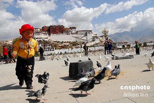 小童與鴿子嬉戲在布達拉宮廣場。中新社發 張權 攝