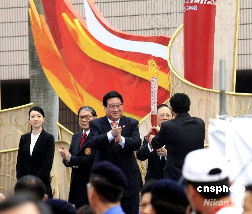 曾蔭權從北京奧組委執行副主席楊樹安手中接過火炬。中新社發 王麗南 攝