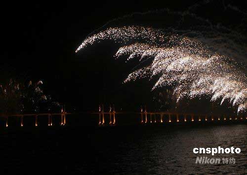 五月三日晚,澳門舉行煙花匯演,慶祝奧運火炬在澳門順利傳遞。中新社發 武仲林 攝