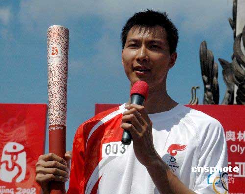 在NBA效力的中國球員易建聯四日跑第三棒,他祝愿北京奧運會取得圓滿成功。中新社發 王辛莉 攝