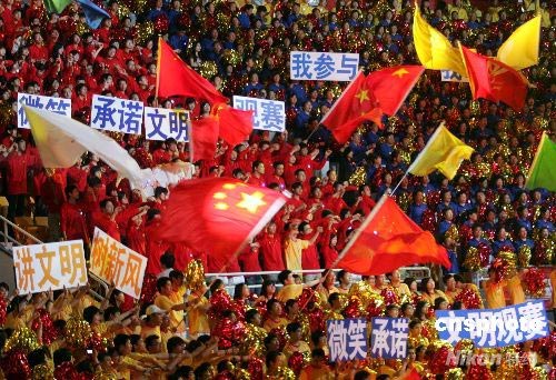5月4日,“微笑北京、志愿奧運——北京奧運會、殘奧會志愿者誓師大會”在北京舉行,來自北京多所大學(xué)的學(xué)生代表所有志愿者,手舉標(biāo)語、揮舞國旗,并莊嚴宣誓。據(jù)悉,北京奧運會、殘奧會賽會志愿者報名人數(shù)超過112萬,城市志愿者人數(shù)超過157萬。中新社發(fā) 張宇 攝