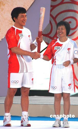 北京奧運會火炬接力三亞傳遞于五月四日晚六時左右圓滿結束, 最后一棒火炬手著名影星成龍和三亞天涯鎮女鎮長蒲慧芳在該段傳遞終點天涯海角點燃圣火盆。 中新社發 王辛莉 攝