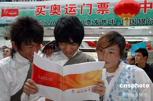 5月5日上午,北京奧運會第三階段門票開始在拉薩銷售,該銷售工作與全國同步進行。奧運會門票的銷售,引起了拉薩市民的極大熱情。在西藏奧運會門票銷售點的中國銀行西藏自治區(qū)分行里,購買奧運會門票的市民排起了長長的隊伍。圖為西藏大學的學生在看購票參考手冊。 中新社發(fā) 周波 攝