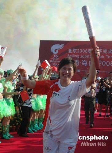 5月6日,北京奧運(yùn)圣火在中國境內(nèi)海口市傳遞,為海南省贏得第一枚金牌的帆板運(yùn)動(dòng)員王麗芳傳遞海口第一棒。圖為她從起點(diǎn)儀式上起跑。中新社發(fā) 王辛莉 攝