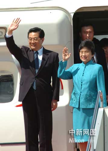 當地時間5月6日下午1點45分左右,中國國家主席胡錦濤乘專機抵達日本羽田機場,開始對日本為期5天的國事訪問。圖為胡錦濤主席及夫人劉永清在機艙門口向歡迎人群揮手致意。中新社記者 朱沿華 攝