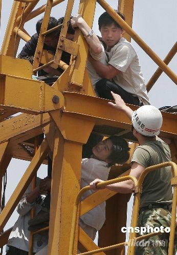 一名男青年因?qū)Ω赣H在建筑工地猝死賠償不滿而爬上30多米高的塔吊頂端,身懸空中,意欲輕生。生死攸關(guān)之時(shí),消防官兵經(jīng)過(guò)兩個(gè)多小時(shí)的巧妙周旋和艱難營(yíng)救,男青年被安全救回地面。 中新社發(fā) 張曉理 攝