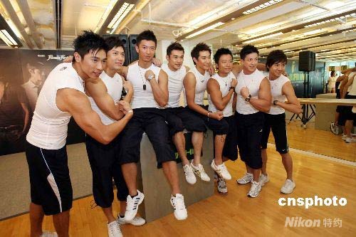 歷屆的“香港先生”高鈞賢、黃長發、袁偉豪等以陽光活力造型出場宣傳。中新社發 洪少葵 攝