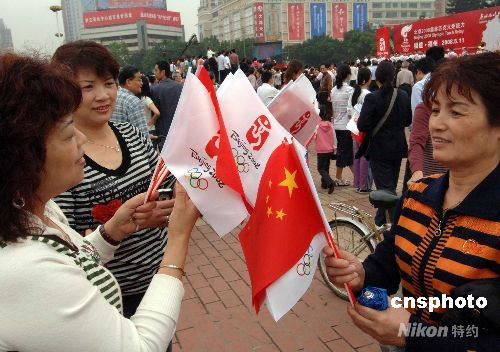 5月10日,三名專程返榕的旅美福州鄉(xiāng)親在福州五一廣場(chǎng)相互分發(fā)五星紅旗和北京奧運(yùn)會(huì)會(huì)徽旗,準(zhǔn)備在5月11日奧運(yùn)圣火在福州進(jìn)行傳遞時(shí)為火炬手歡呼加油。中新社發(fā) 劉可耕 攝