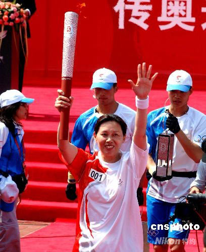 福建籍的奧運(yùn)冠軍、中國女排名將鄭美珠跑出奧運(yùn)圣火福建傳遞首站福州站的第一棒。中新社發(fā) 劉可耕 攝
