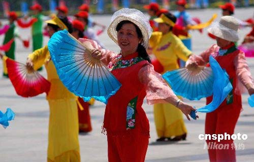 圖為廈門市民在烈日下歡歌起舞,迎接圣火。 中新社發(fā) 傅丹丹 攝