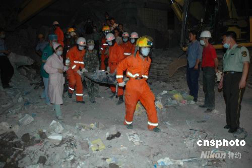 12日下午2:30左右,受四川汶川地震波及,重慶市梁平縣文化鎮一小學教學樓發生垮塌。13日凌晨1時許,搜救工作已全部結束,垮塌造成5人死亡,36人受傷。圖為消防將剛搜救出一名傷者。 中新社發 郭虹 攝