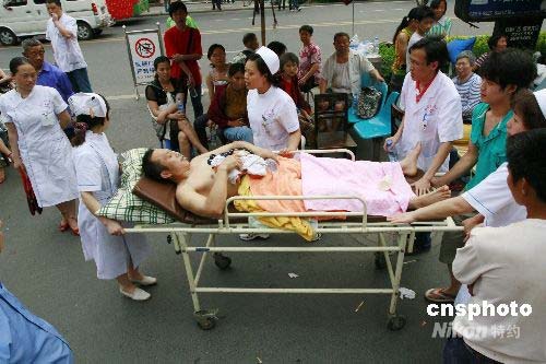 5月12日,四川省遂寧市船山區人民醫院將病人疏散到安全地帶繼續治療。當日14時28分,四川汶川發生7.8級地震,波及幾百公里之外的遂寧市,時間持續2分多鐘,造成當地部分房屋倒塌。截止發稿之時,人員傷亡情況正在統計之中。目前當地政府已經啟動緊急預案,城市將人員疏散到安全地帶,群眾情緒穩定,社會持續井然。中新社發 鐘 敏 攝