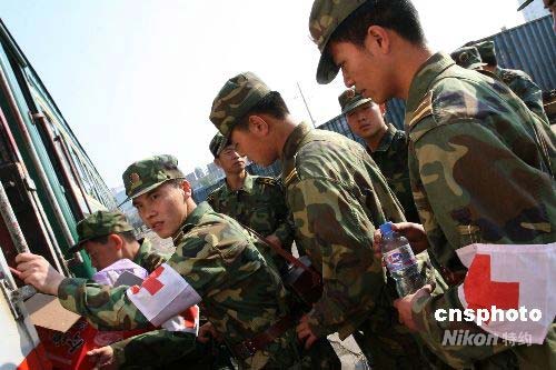5月13日,駐許昌解放軍某部官兵乘坐專列奔赴四川災區開展救援工作。中新社發 牛書培 攝