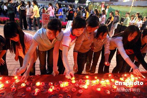 2008年5月13日,鄭州市紫荊山百貨門前,商場員工點起512支蠟燭,在燭光中,商場員工為汶川地震災區的受災群眾祈福,并且現場通過紅十字會為災區捐款,表達愛心。中新社發 馬健 攝
