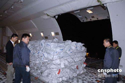 5月14日凌晨,深航旗下中德合資翡翠航空大型貨機(jī)JI7452航班滿載四千頂救災(zāi)帳篷,從天津?yàn)I海機(jī)場(chǎng)裝機(jī)運(yùn)往四川地震災(zāi)區(qū)。中新社發(fā) 陳文 攝