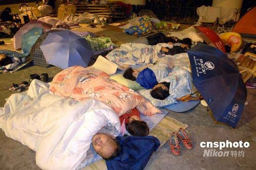 五月十四日凌晨,成都地震災區眾多民眾為預防地震再次來襲,露宿街頭立交橋下。中新社發 陳文 攝
