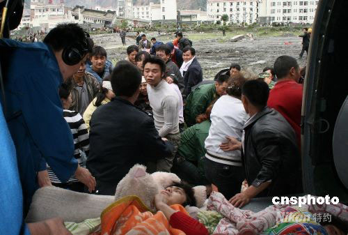 5月14日,成都軍區(qū)某陸航團四架直升機滿載帳篷、礦泉水等災區(qū)急需物資成功降落汶川災區(qū),為災民送去了生活必需品。當日中午,第一批40名重傷員隨機返抵成都,被送往醫(yī)院救治。中新社發(fā) 張雷 黃龍 攝