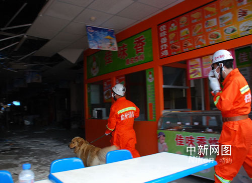 今天,浙江消防搶險救援隊進行四川地震災區現場,圖為搶險救援隊帶領搜救犬進入現場搜救。作 者:李玉飛