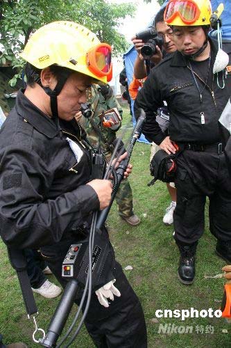 圖為救援隊員在調試視像探測器。中新社發 齊彬 攝