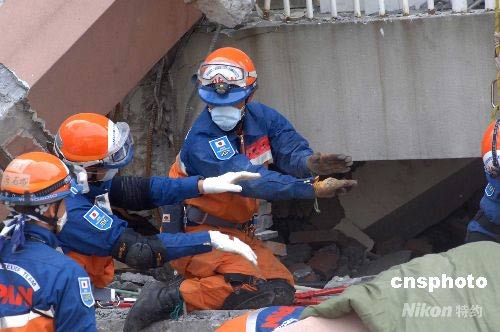 5月18日,日本國際救援隊一行二十余人到達中國四川北川地震現場——北川中學,利用國際先進的探測儀器與中國兩支救援隊分別挖掘廢墟,救援受難學生。經過共同探測,在沉入地下的樓層內發現有三個生物體存在,但挖掘極為危險和困難,生者生命渺茫。圖為日本小隊在工作中。中新社發 鄒憲 攝
