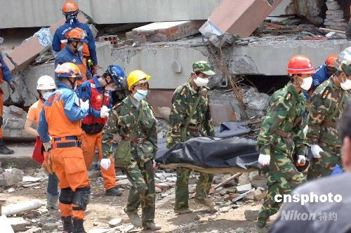 5月18日,日本國際救援隊一行二十余人到達中國四川北川地震現場——北川中學,利用國際先進的探測儀器與中國兩支救援隊分別挖掘廢墟,救援受難學生。經過共同探測,在沉入地下的樓層內發現有三個生物體存在,但挖掘極為危險和困難,生者生命渺茫。中新社發 鄒憲 攝