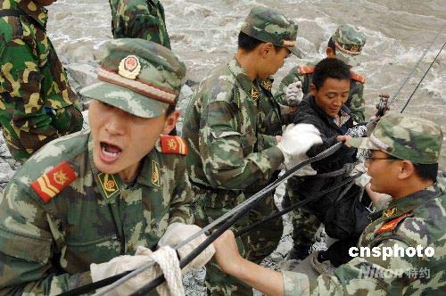 武警官兵在汶川岷江營救轉移地震災民(2)