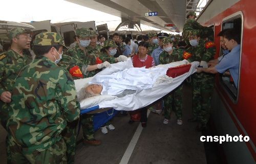 2008年5月19日,按照鐵道部的統(tǒng)一部署,成都鐵路局開行首趟運送地震災區(qū)受傷群眾專列,19日1O:20從綿陽發(fā)車,當日16:57到達重慶北站。運送了206名地震受傷群眾及家屬前往重慶接受治療。該次專列專列車次為57005/6/5次路用傷員列車,編組19輛,全部為25G空調硬臥車。其中硬臥15輛并配備餐車及行李車。