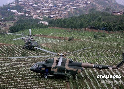 成都軍區(qū)陸航團空降救兵到受災(zāi)嚴(yán)重的高山羌寨,建立救災(zāi)基地。中新社發(fā) 賈國榮 攝