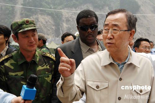 圖:聯(lián)合國秘書長潘基文在映秀鎮(zhèn)察看地震災(zāi)情