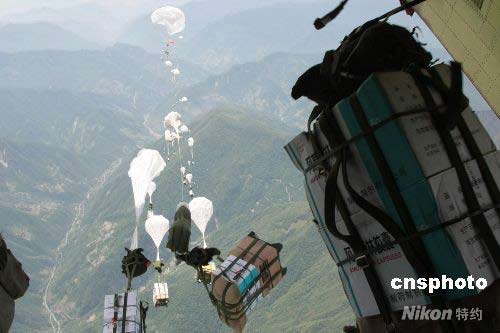 5月16日,中國空軍航空兵某師在向四川地震災(zāi)區(qū)空投救災(zāi)物資。空軍發(fā)揮空中運(yùn)輸優(yōu)勢(shì),連續(xù)出動(dòng)大型運(yùn)輸機(jī),不間斷大規(guī)模向四川災(zāi)區(qū)投送災(zāi)民急需的藥品、食物、帳篷等急需的生活用品。中新社發(fā) 譚超 攝