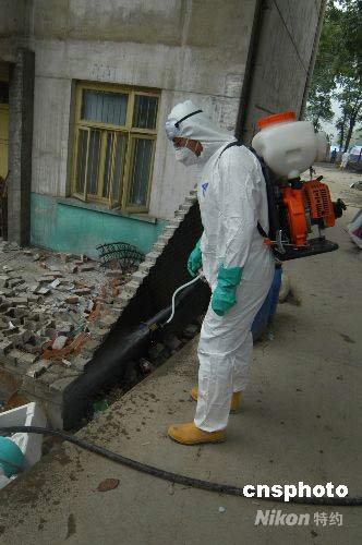 防疫人員在對(duì)北川中學(xué)教師宿舍樓消毒。中新社發(fā) 成和平 攝