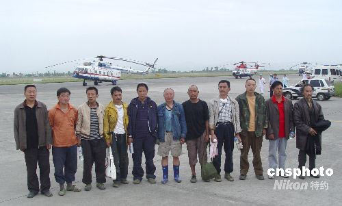 5月29日下午,被困17天的10名清平磷礦礦工,被民航直升機救出。剛走下飛機的被救礦工付學斌說,這17天來靠吃野菜和直升機空投的食品維持生命。5月12日那天,地震時他們都在磷礦上班,傷亡不是很大,主要是在家的親人都被這次地震給吞沒了。執(zhí)行這次營救任務的是中信海直的AS332型7961號和東方通用航空的米171型7856號飛機。據(jù)民航直升機抗震指揮部副總指揮關(guān)立欣講,受天氣影響,全天共出動直升機10架次,執(zhí)行飛行任務24架次,運進救災物資10.1噸,救援人員13人,接運出被困群眾和傷員47人,財務檔案600公斤。中新社發(fā) 張鈺昱 攝