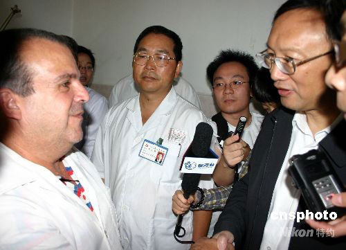 5月30日上午,中國外交部部長楊潔篪來到四川省人民醫(yī)院,看望在這里救治地震災(zāi)區(qū)傷病員的古巴醫(yī)療隊(duì),感謝他們給予四川地震災(zāi)區(qū)民眾的關(guān)心,并高度贊揚(yáng)了他們的國際人道主義精神。中新社發(fā) 楊杰 攝