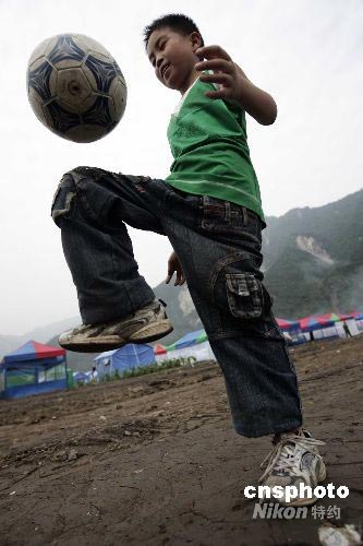 圖:什邡紅白鎮(zhèn)災區(qū)的男孩在空地上踢球
