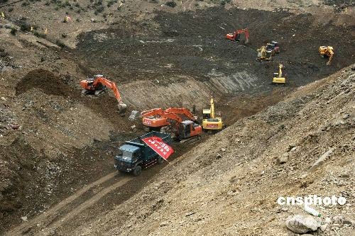5月31日,唐家山堰塞湖瀉流槽已基本挖通,目前堰塞湖的水位離堰塞湖槽的出水有7米的距離,將采取自然泄洪的方法分洪,不再進行爆破,分洪的時間要根據上游的來水量確定,大概時間在6月1日到6月5日之間。中新社發 杜洋 攝