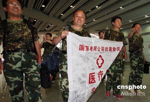 6月1日,國家電網公司抗震救援隊和北京電力醫院抗震救援醫療隊從災區回到北京。中新社發 錢興強 攝