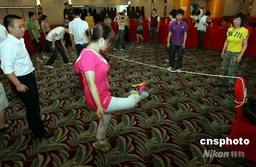 五百余名北京單身青年6月1日在某婚戀網站的組織下,參加一場主題為“找個老婆過家家”的相親派對,“歡度六一國際兒童節”。青年男女們在現場一起“丟手絹”、“抓人”、“跳房子”、“老鷹抓小雞”,一個個經典的童年游戲,讓現場的會員很快消除了陌生感。中新社發 楊可佳 攝