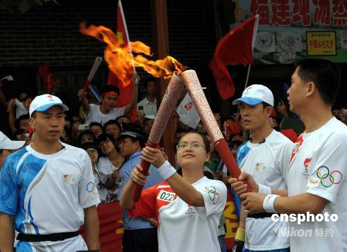 圖為22號火炬手點燃“祥云”火炬。中新社發 廖攀 攝