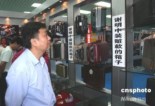 六月三日,海口開幕的2008海南反腐倡廉警示教育展覽,展出原海南省委委員、文昌市委書記謝明中裝贓款的十八只箱子,以及價值四十萬元人民幣的滿天星手表等贓物。謝明中在擔任文昌市委書記期間,利用職權,在工程審批、資金安排、干部提拔等方面為他人謀取利益,大量收受或索取賄賂,還與多名女性發生不正當男女關系。海南省紀委共查獲謝明中轉移或藏匿的賬款折合人民幣兩千五百余萬元,另有金銀首飾等物品十七件。中新社發 關向東 攝
