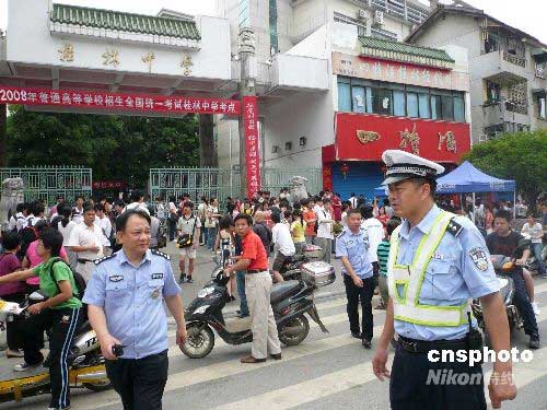 6月7日,全國高考第一天,桂林中學(xué)高考點,交警現(xiàn)場維持秩序。2008年廣西高考報名人數(shù)30萬3778人,首次突破30萬人,比2007年增長3.20%。中新社發(fā) 周利朔 攝