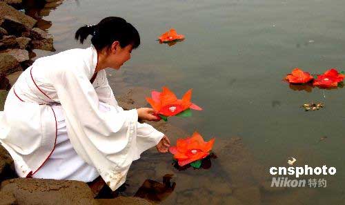 一名身著傳統漢服的福建青年女子向閩江放河燈,悼念在四川大地震中遇難的同胞。中新社發 劉可耕 攝
