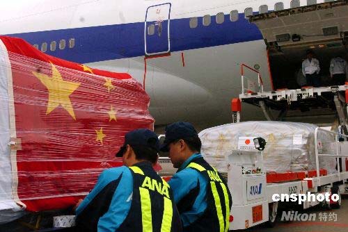 圖為機場工作人員正在往飛機上裝載救援物資。中新社發 朱沿華 攝