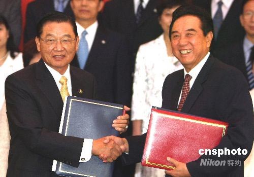 6月13日上午,海峽兩岸關系協會會長陳云林與臺灣海峽交流基金會董事長江丙坤在北京釣魚臺五號樓簽署“兩岸周末包機”和“大陸居民赴臺旅游”協議。中新社發 任晨鳴 攝