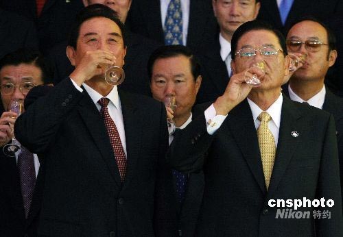 海峽兩岸關系協會會長陳云林(右)與臺灣海峽交流基金會董事長江丙坤在簽署“兩岸周末包機”和“大陸居民赴臺旅游”協議后,共飲“慶功酒”。中新社發 任晨鳴 攝