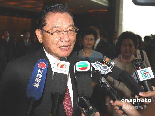 6月14日8時25分許,;鶗麻L江丙坤離京返臺前在下榻的北京金融街洲際酒店前回答記者提問。中新社發 趙振清 攝