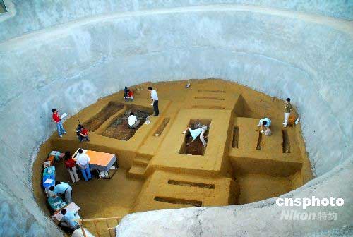 2008年6月15日,安徽省蚌埠市雙墩一號墓發掘現場。從2006年12月開始,安徽省文物考古研究所展開對雙墩1號墓的發掘,目前已接近尾聲。據考古專家論證,春秋時期鐘離國在安徽省蚌埠和鳳陽一帶,今天的“鐘離”和“鐘”姓,一說即來源于該國。鐘離國是春秋時期的一個小國,蚌埠雙墩一號墓位于“鐘離城”遺址不遠,從墓葬規模和陪葬物品等種種跡象表明,這個奇特的超級大墓,極有可能就是當時鐘離國的國君。目前發掘工作仍在進行。中新社發 從啟 攝